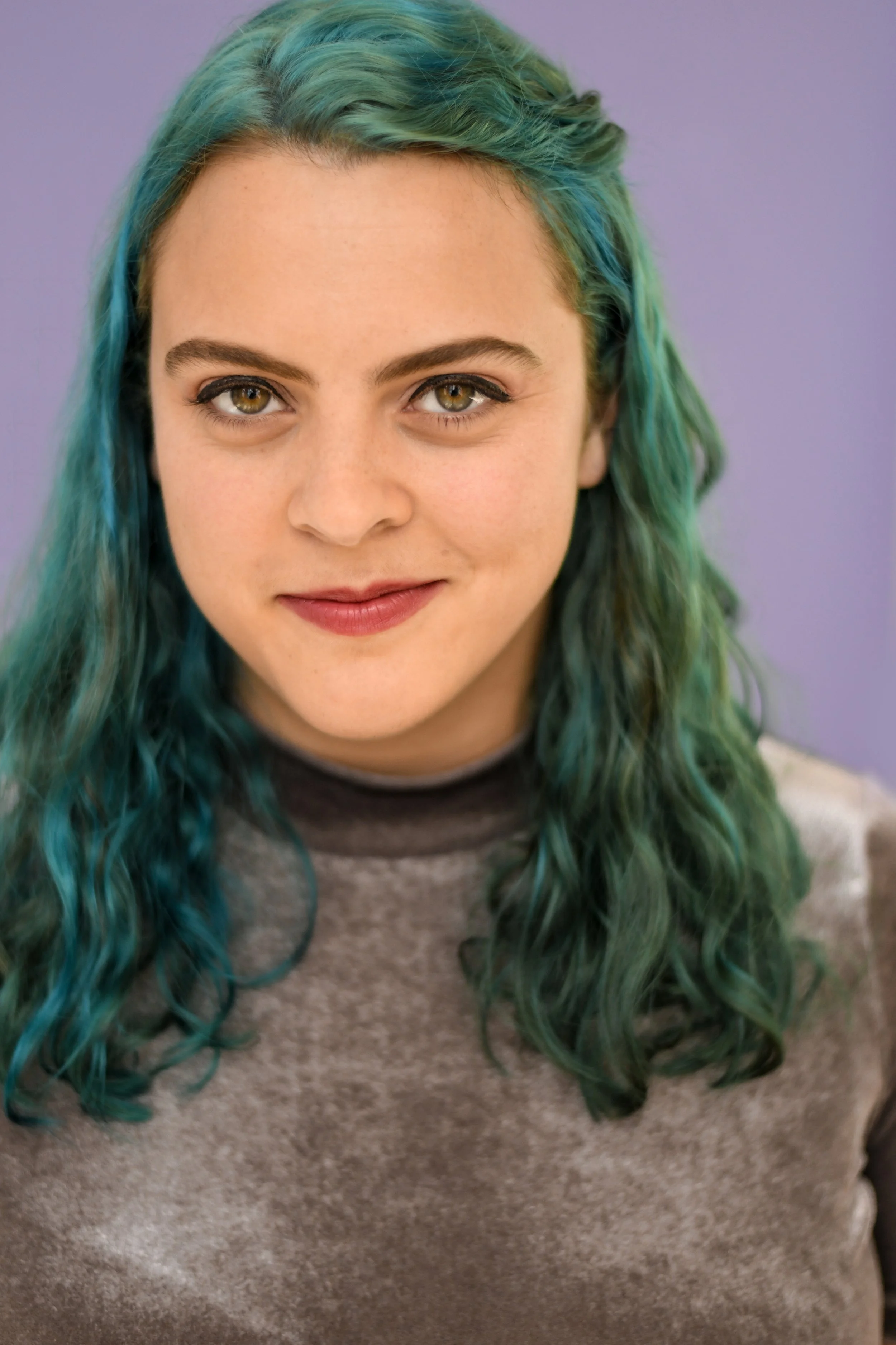 A headshot of Kayla, a white person with long blue hair and green eyes.